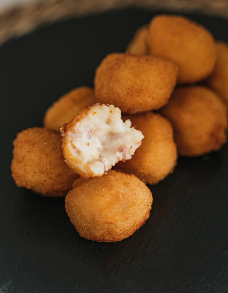 Elaboradas con un interior suave y cremoso, enriquecido con auténticos taquitos de jamón, que aportan un sabor intenso y equilibrado. Cada croqueta es rebozada con cuidado para lograr ese toque crujiente y dorado que las hace irresistibles.