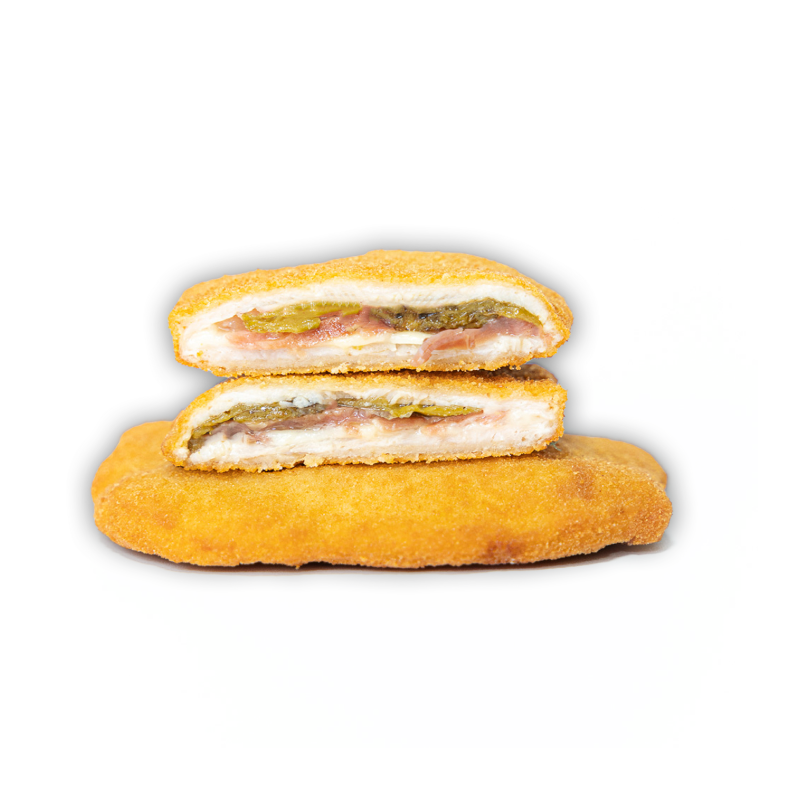 Os traemos el auténtico sabor andaluz en formato práctico: nuestro serranito de pollo con pimiento y jamón. Elaborado con un filete de pollo empanado, relleno de jamón y pimiento, combina lo mejor de la tradición con la comodidad de un producto ultracongelado, fácil y rápido de preparar.